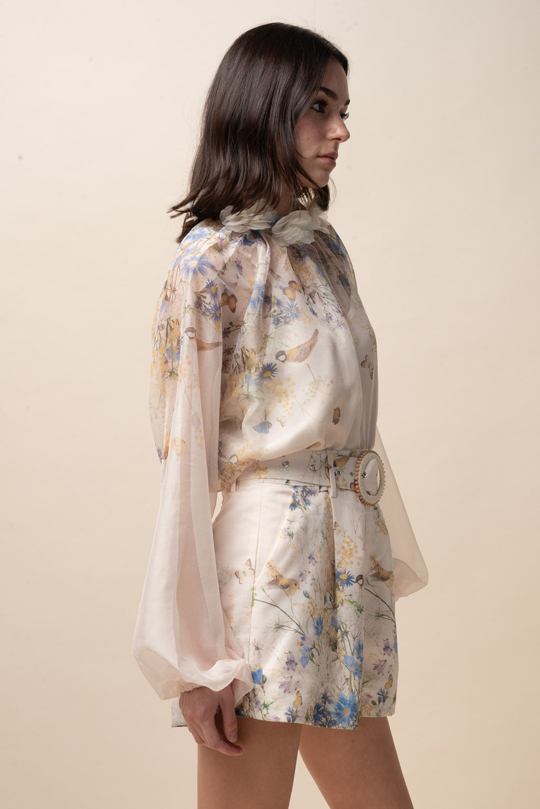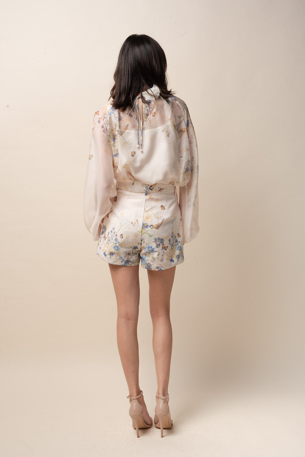 Etheral and polished. A sheer floral blouse with voluminous sleeves and a soft neckline adorned with flowers. Paired with tailored high rise belted shorts in a matching print. Soft neutrals and pastel florals give this set a vintage daydream energy. Light, feminine and chic.