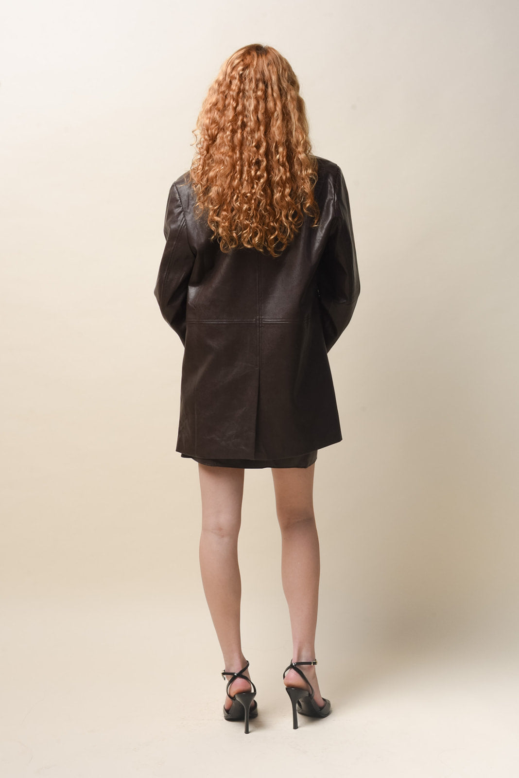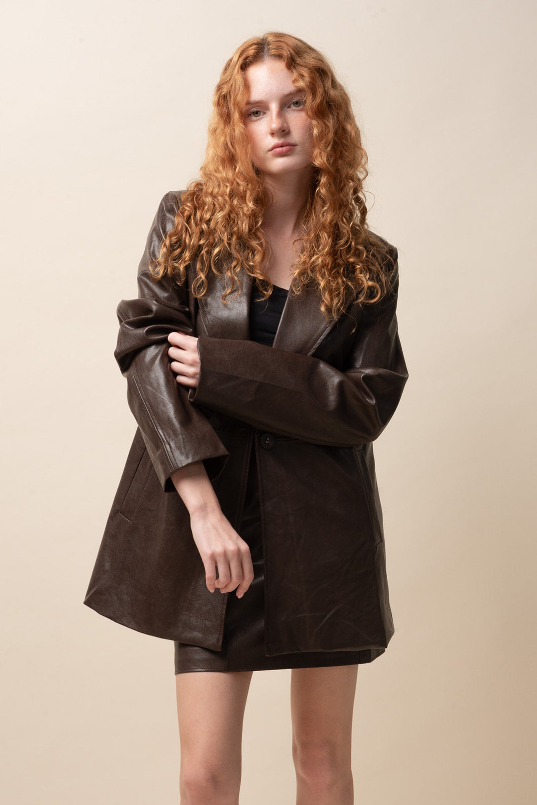 A timeless staple set reimagined the Anecdote way. This oversized brown blazer features a soft structure, single button front and a slightly elongated cut. Comes with its mini skirt that makes the outfit chic & cohesive. Use with a sweater to make the look cozier. Black tank top is not included.