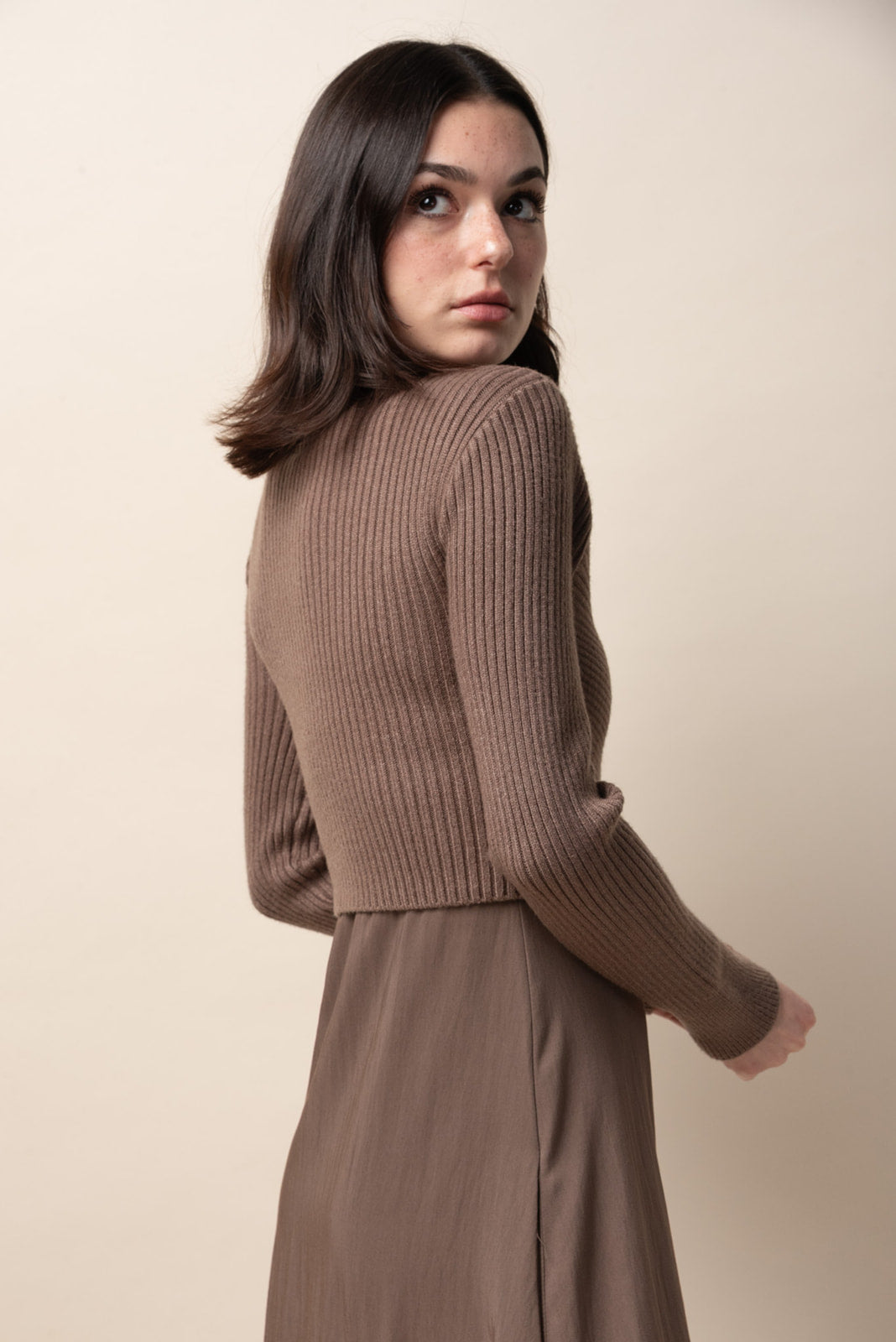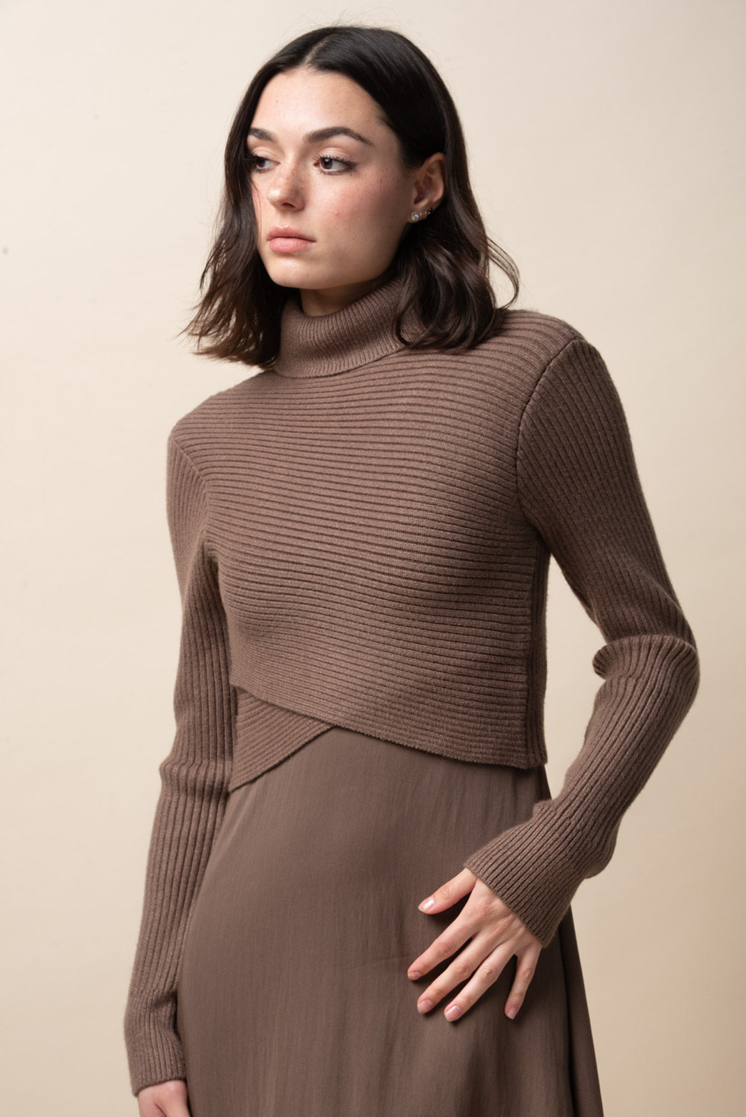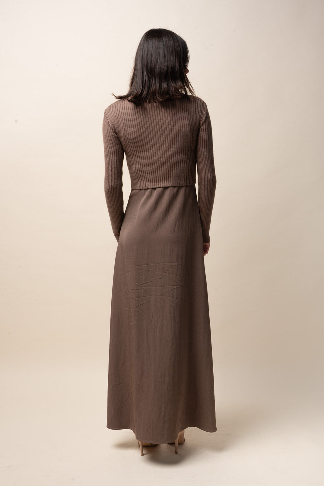 Two in one elegant kind of dress. A fluid mocha maxi layered with a ribbed turtleneck overlay for a refined look. Tonal textures keep it minimalist and luxe. Fully lined.