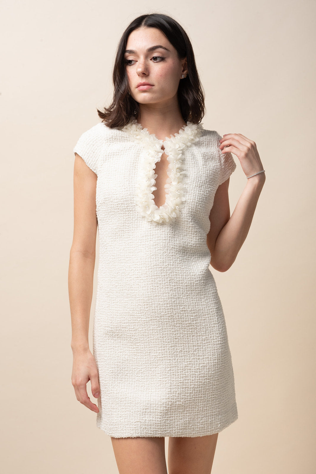 A nod to timeless elegance with a modern twist. Crafted from white soft tweed, this mini dress features a sculpted silhouette and a statement textured neckline.
