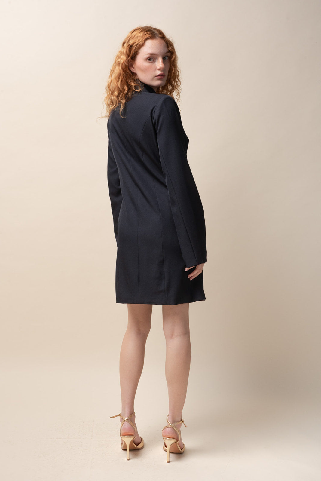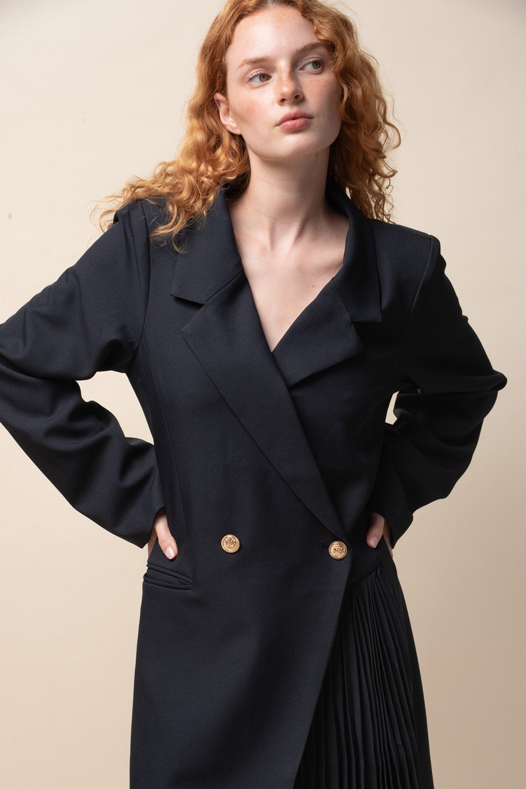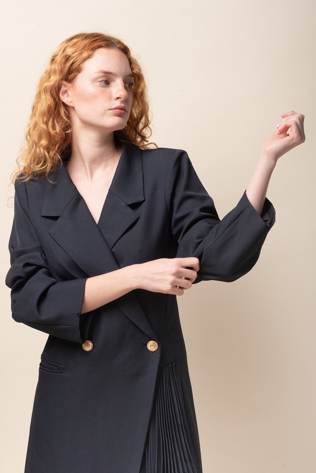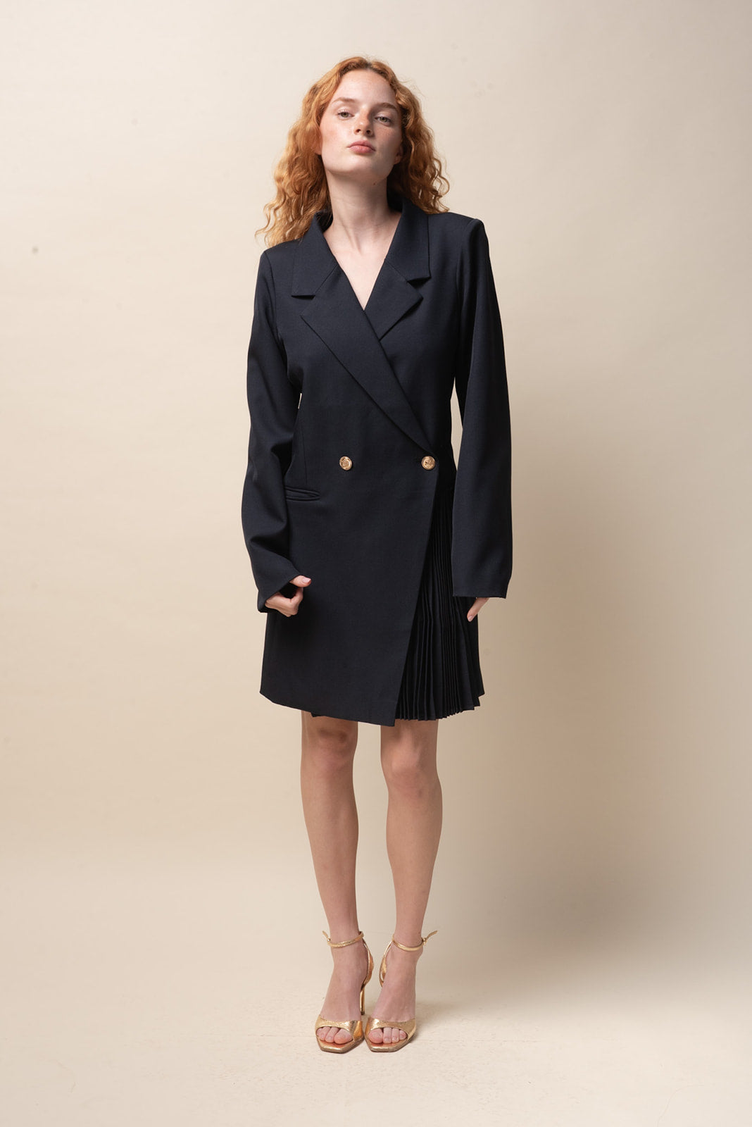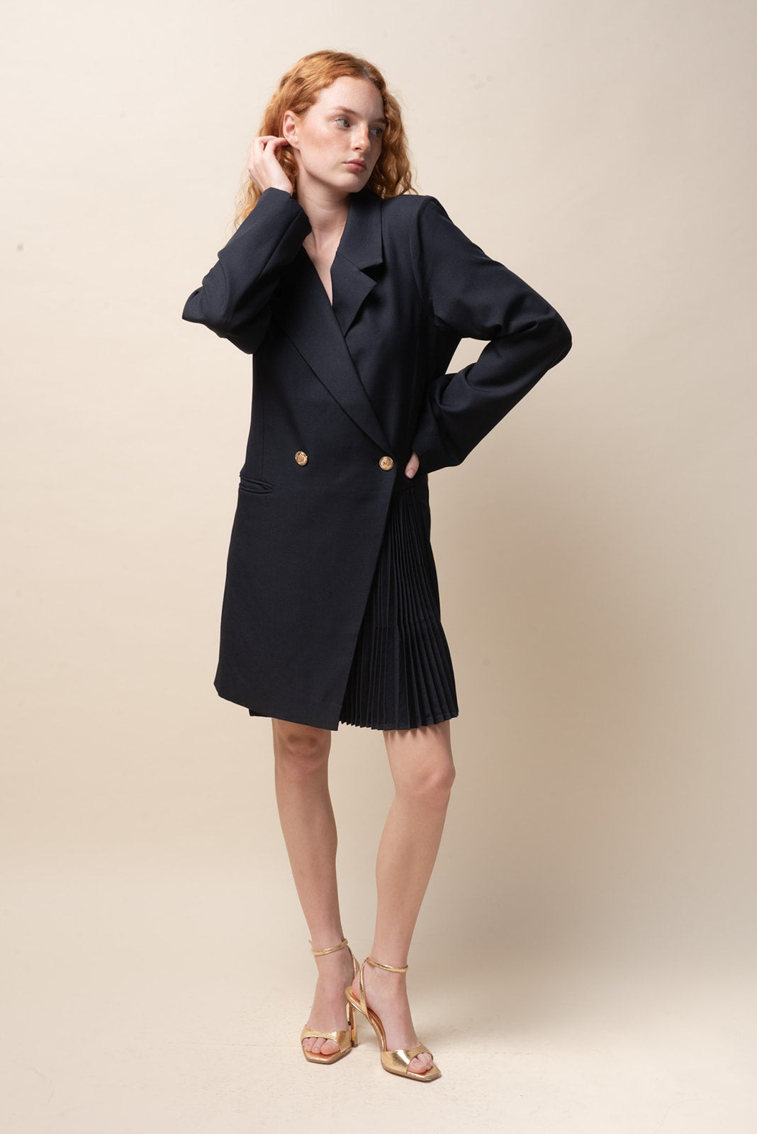 Navy tailoring meets movement. A double breasted mini dress featuring gold tone buttons and a sharp pleated insert that adds a touch of fluid femininity to the structured frame. Designed for the woman who command attention without trying.