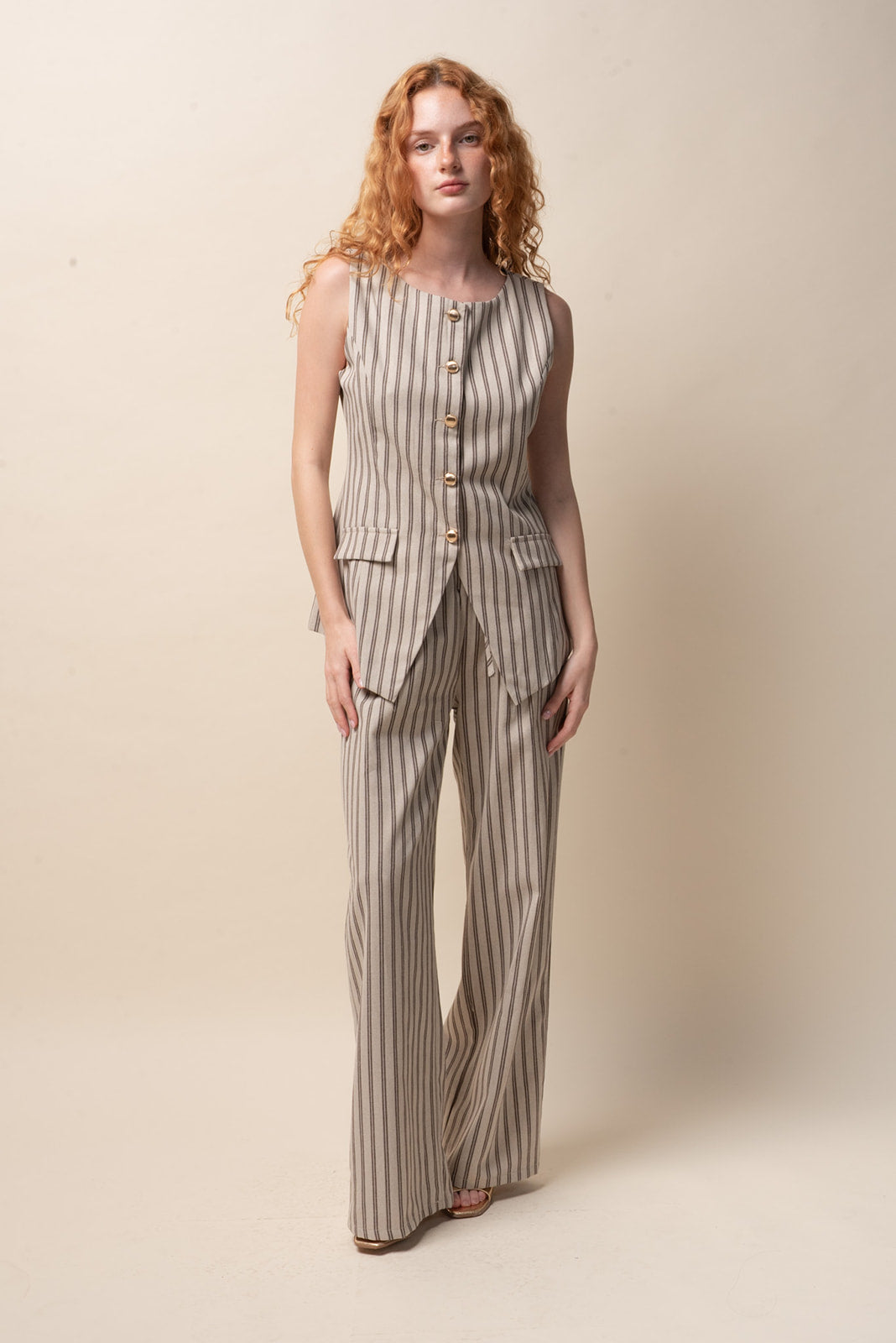 A relaxed take on tailoring. The longline, sleeveless vest features vertical stripes, sculpted seams and gold tone buttons. Paired with matching pinstripe trousers that can be adjusted from the waist.