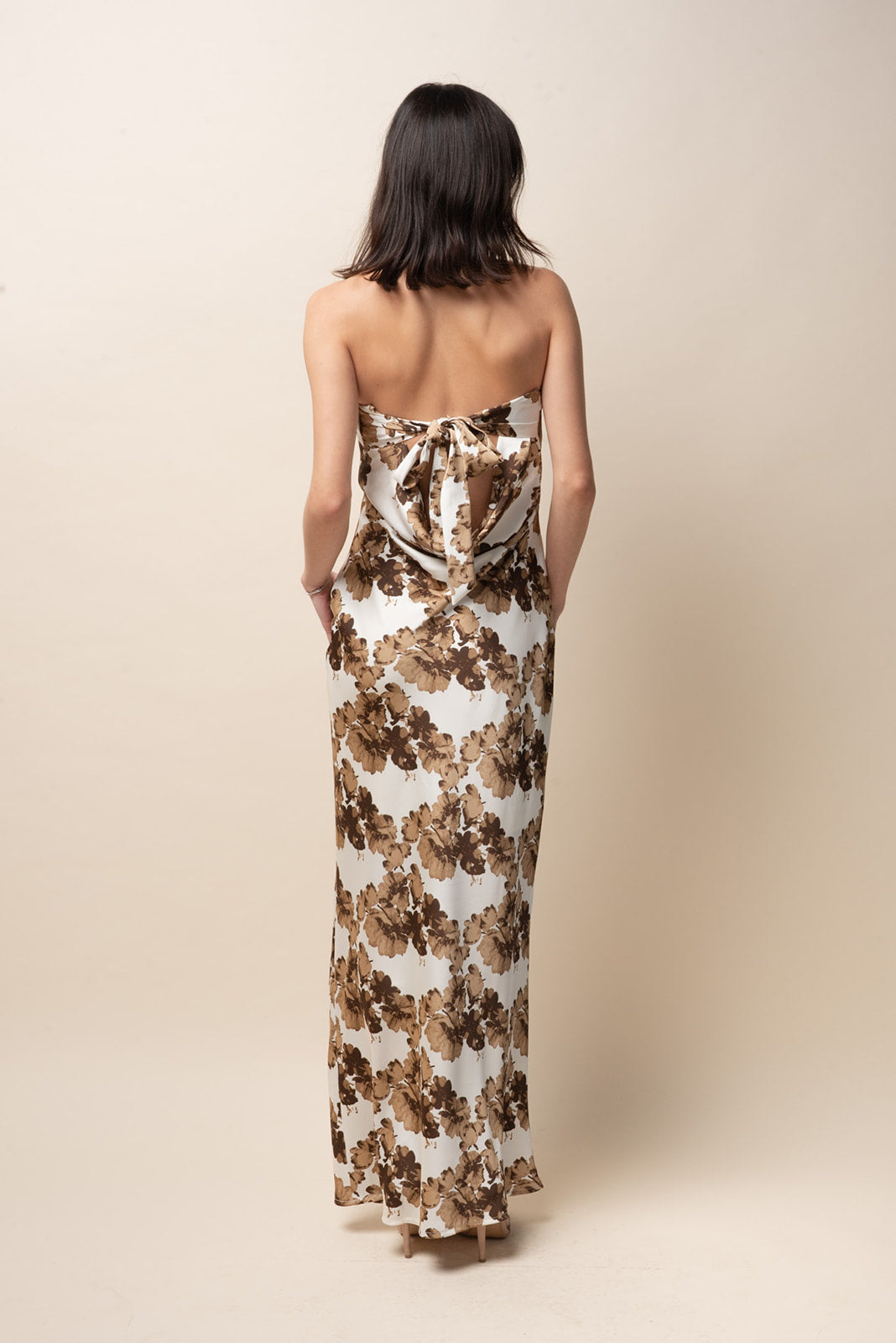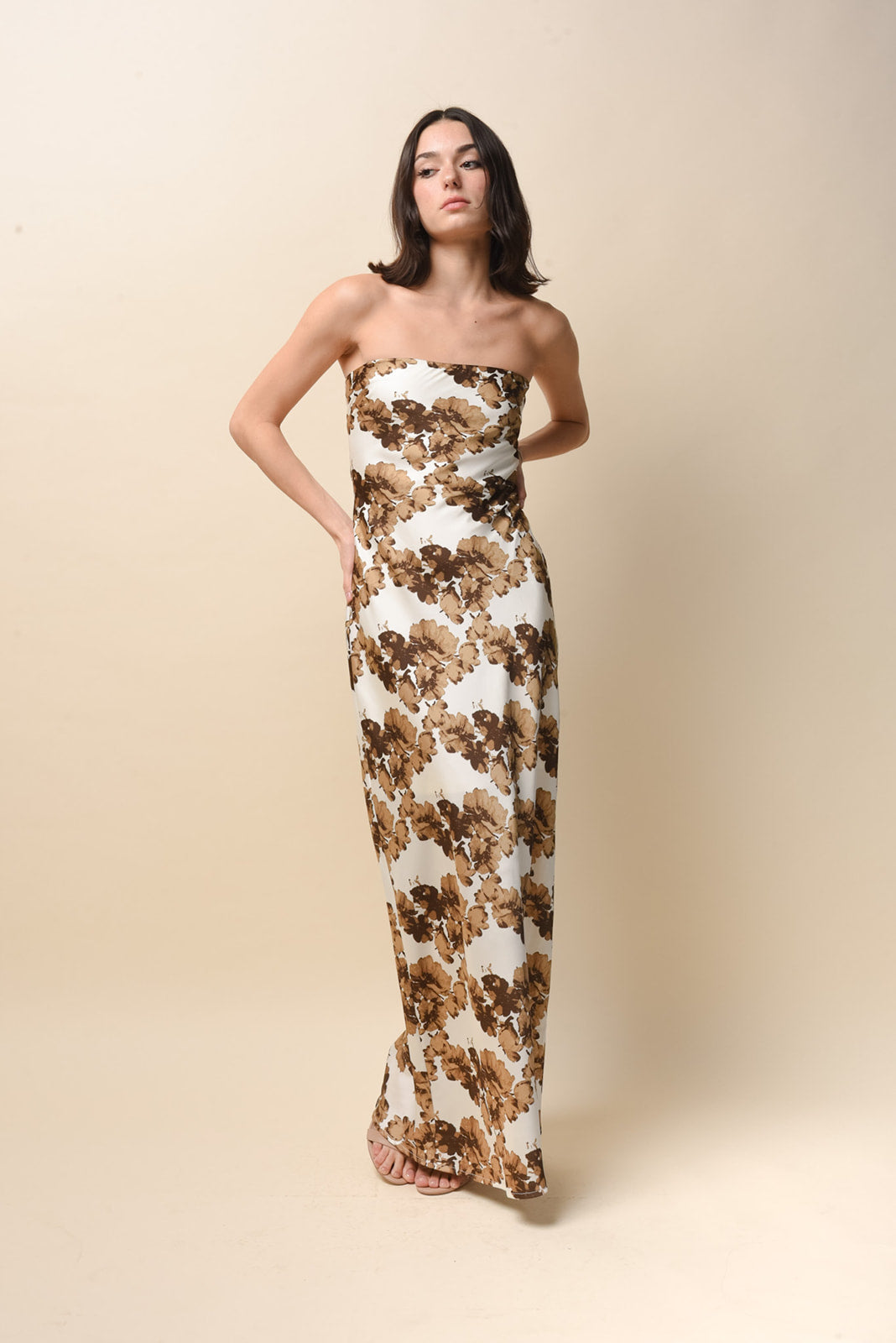 Minimalist lines meet a modern floral. This strapless column slips on with ease. Straight column silhouette with a smooth open back that can be easily adjusted.