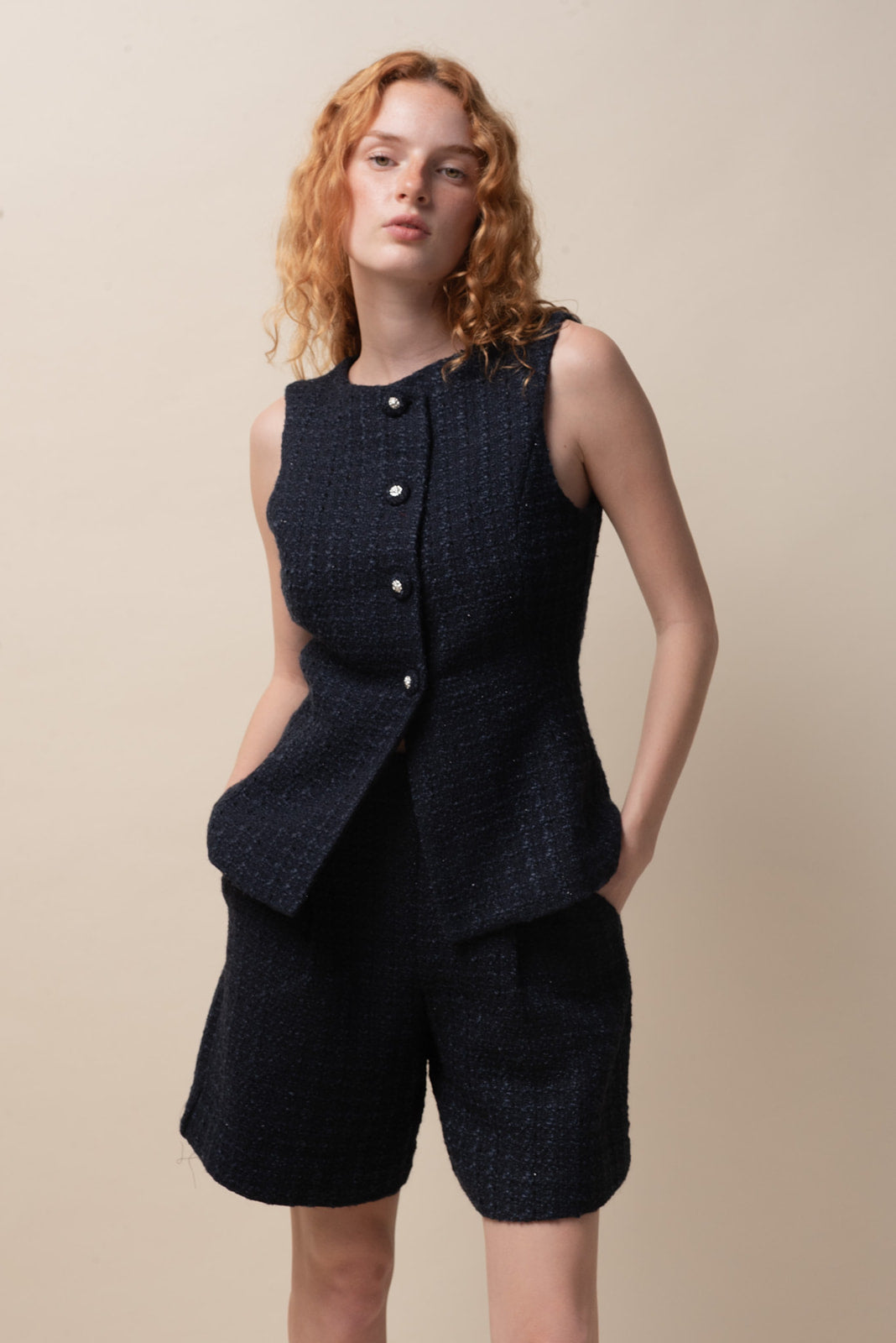 A navy structured sleeveless vest in a textured tweed with delicate statement buttons. Comes with matching tailored shorts that are perfect for those who love longer shorts that aren’t quite bermudas, offering balance of comfort and sophistication.