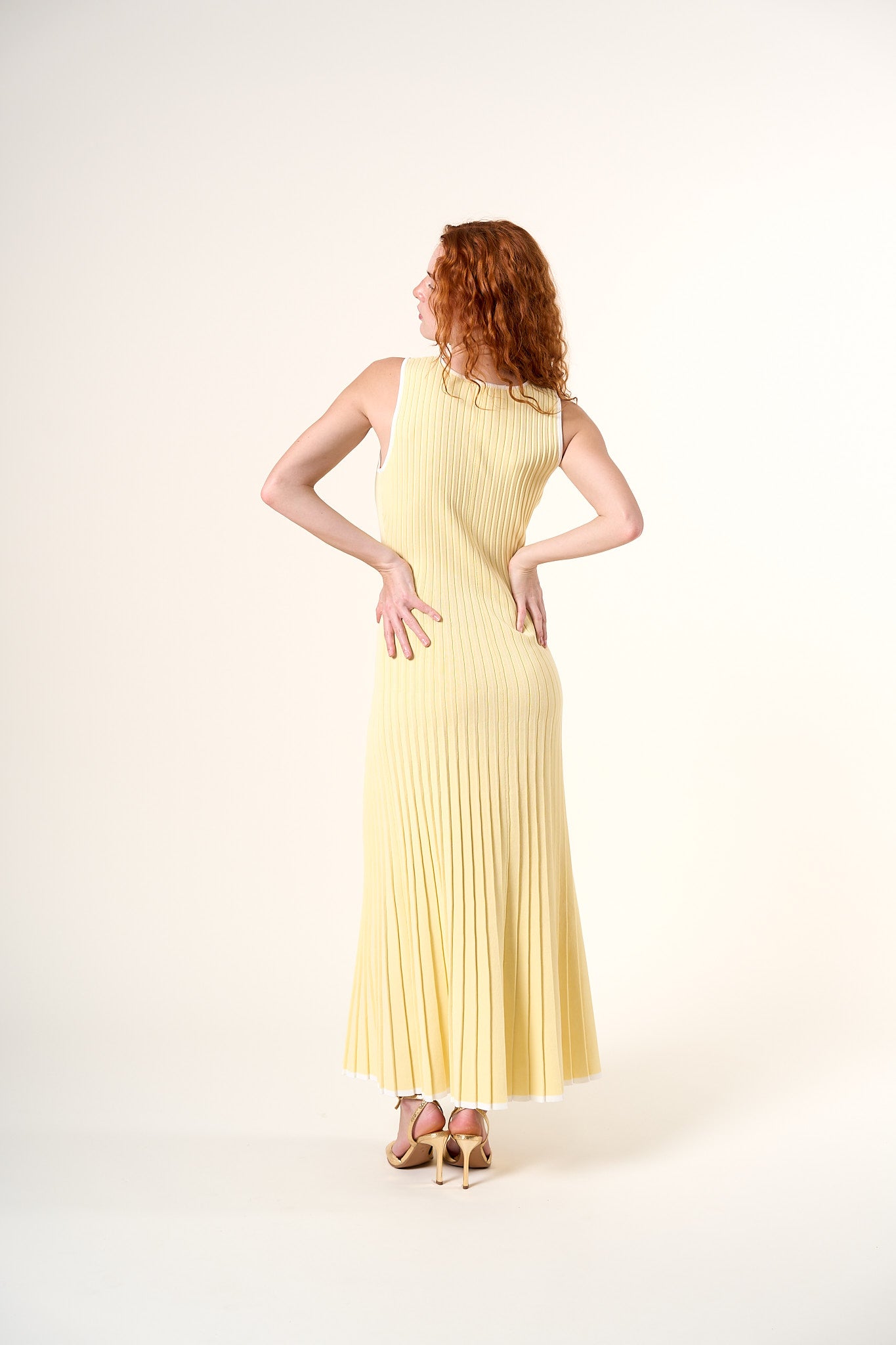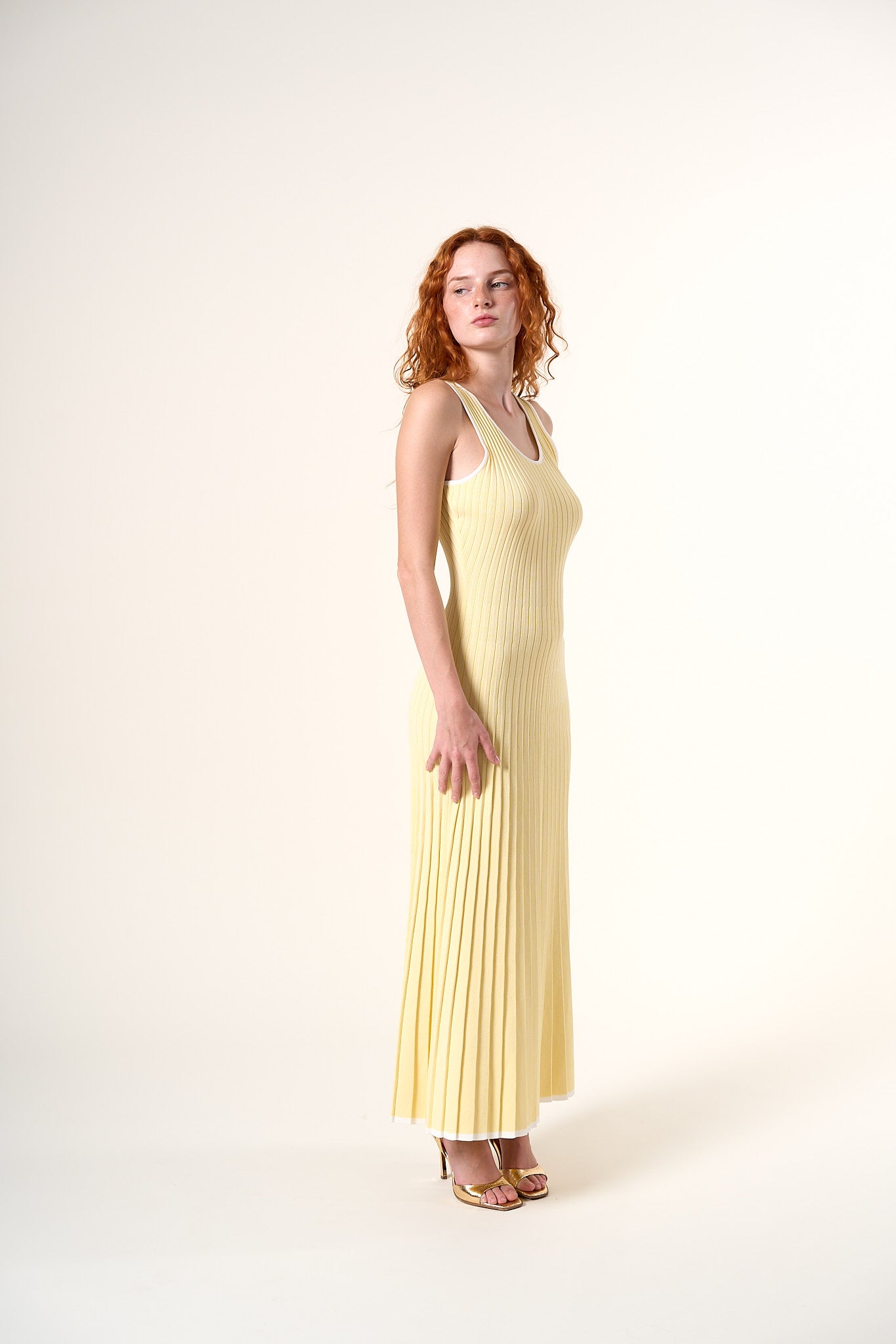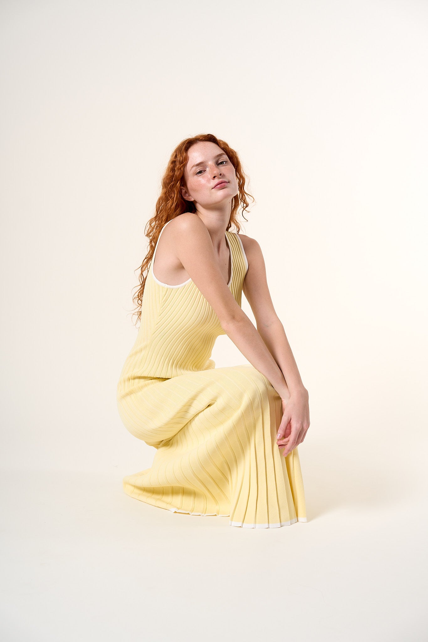 The viral butter yellow Paige dress. Effortless and timeless, this knit combines a fitted ribbed top with a flowing pleated skirt. Flattering, versatile & a chic day to night. A piece you’ll keep coming back to.