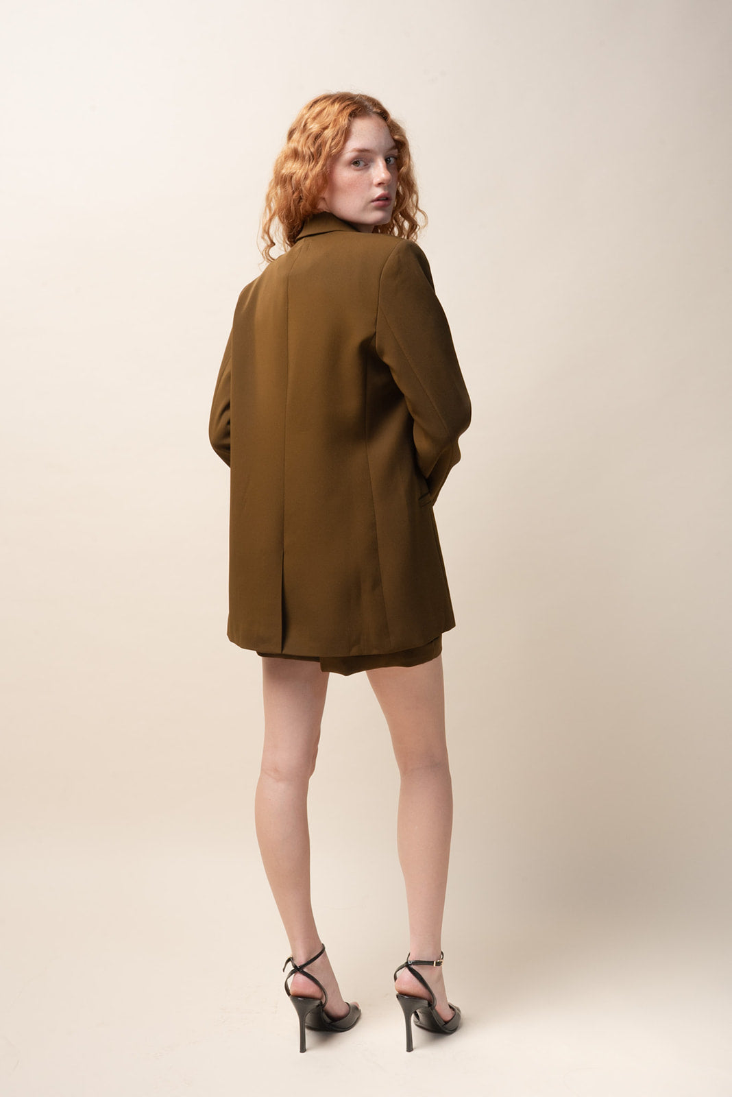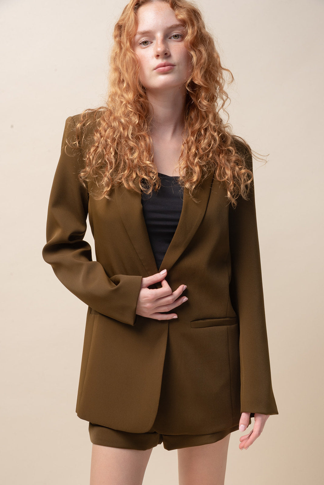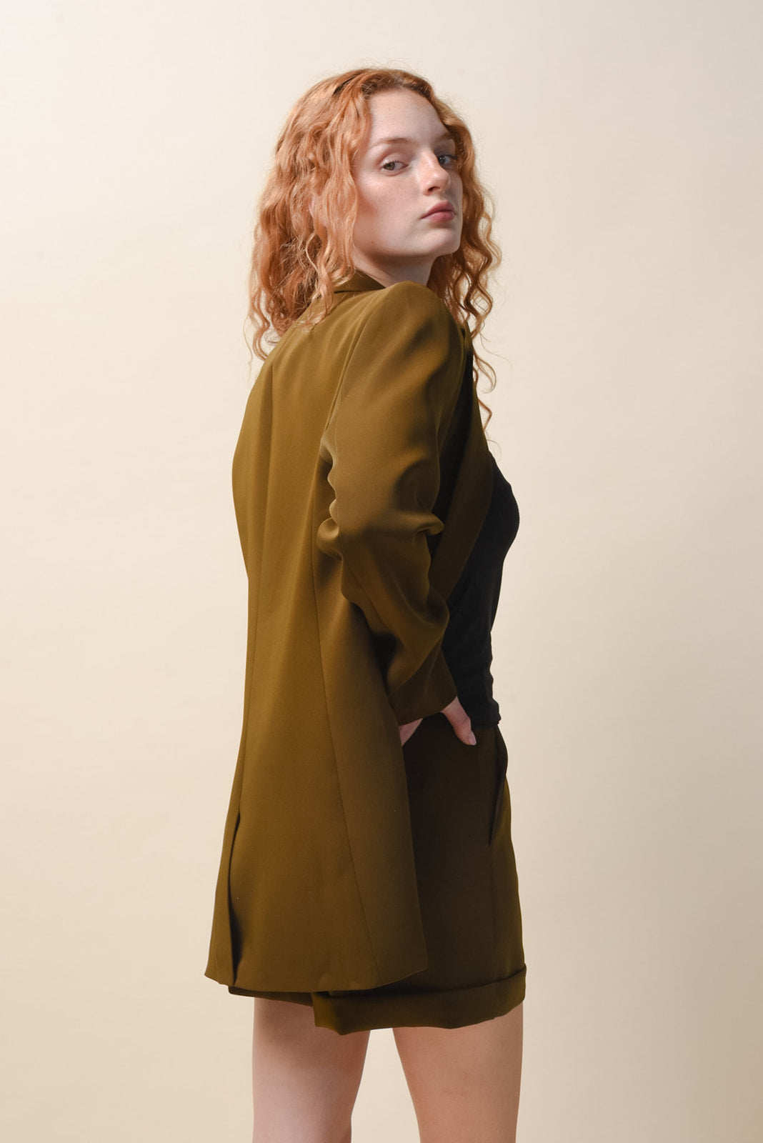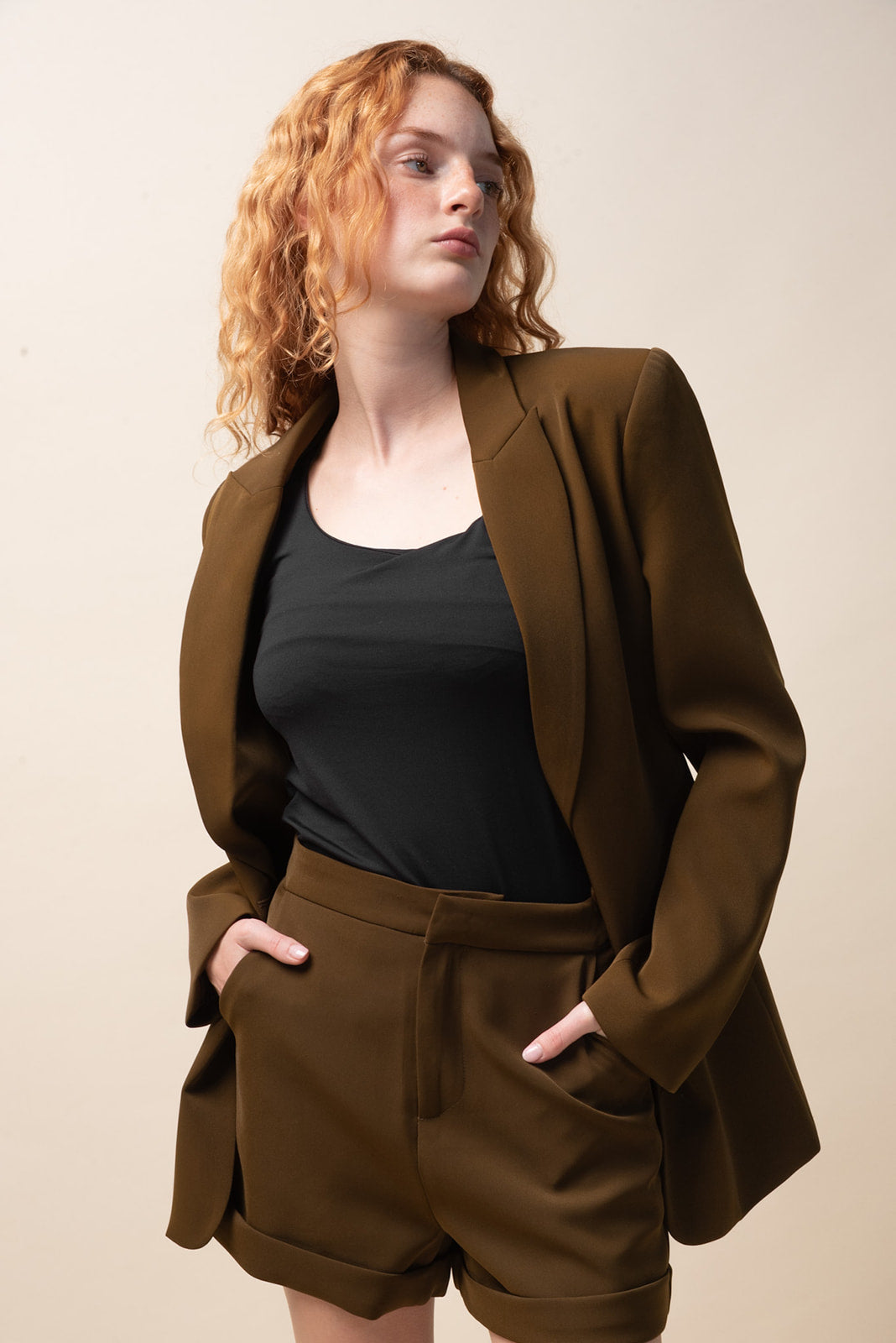 Effortlessly tailored, endlessly versatile. This deep olive toned blazer and short set combines modern structure with a relaxed silhouette that transitions from day to night. We recommend styling it with a brown or oatmeal knit for an elevated fall look. Tank top is not included.
