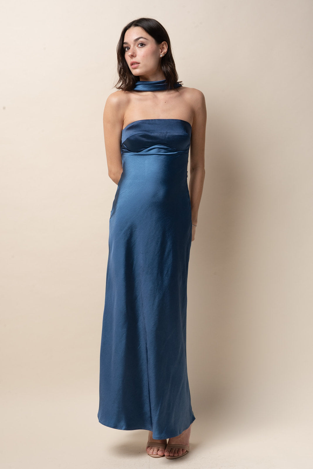 Like liquid midnight. Paula is a strapless gown that wraps the body in a gentle sheen, with a neck scarf that adds a touch of quiet drama. Minimal yet memorable with a statement open back.